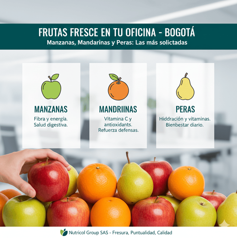 Las manzanas, mandarinas y peras son las frutas más solicitadas en oficinas de Bogotá. Conoce sus beneficios nutricionales y cómo Nutricol Group SAS las entrega frescas en tu empresa.